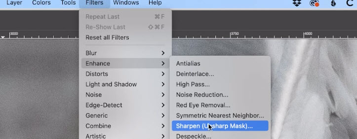 You can simply hover to the menu > Enhance > Sharpen (Unsharp Mask), and click on it.