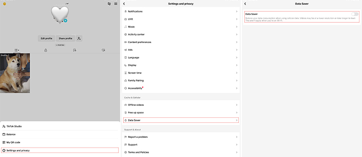 The Data Saver mode is to reduce cellular data usage when you scroll TikTok. When it's enabled, TikTok might compress your videos to a lower quality to reduce the file size, which will result in a lower resolution and poor video quality. Here's how to disable the data save mode and upload high quality videos to TikTok.