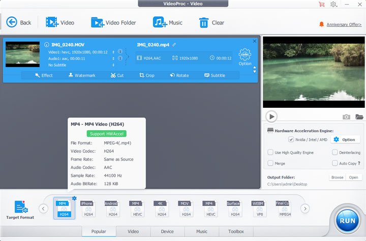 We recommend you use MP4(H.264 +AAC). It's the most compatible format for Windows and mainstream platforms. Moreover, exporting H.264 can trigger level-3 hardware acceleration on the VideoProc Converter AI system, which can greatly speed up the conversion process.