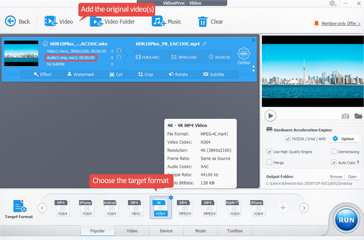 With VideoProc Converter AI, converting EAC3, AC3, DTS, and various video/audio files to a codec compatible with MX Player is as easy as a single click. You can adjust video sample rate, bitrate, channel numbers, and other settings. The adoption of High Quality Engine ensures that the conversion maintains picture and sound quality.