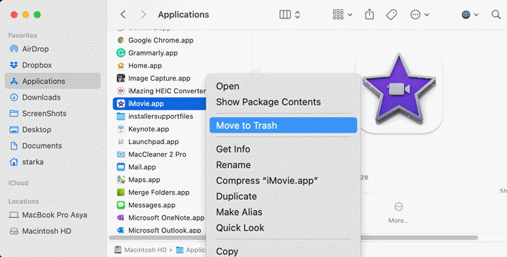 - To reinstall the software, open Finder, and navigate to Applications > iMovie. Right-click the app icon, and select "Move to Trash". Then open Finder again, and from the top, click Go > Go to Folder. In the pop-up, enter ~/Library. Select the iMovie-related files, which are typically found in folders like Caches, Containers, Application Support, and Preferences, move them to Trash, and empty the Trash afterward permanently to remove iMovie and its associated files. Then you can reinstall it on your Mac and check if the error 'not enough disk space for iMovie' persists.