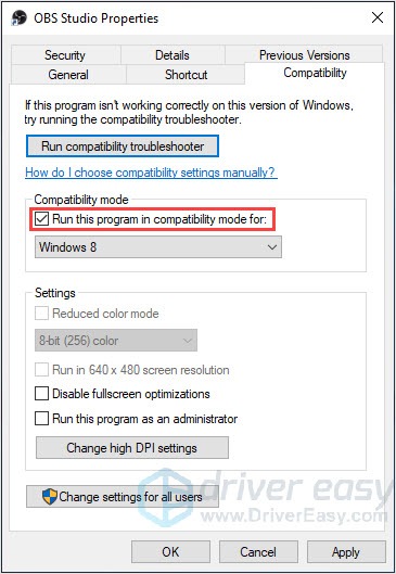 Select the OBS program or shortcut with a right-click. Click on "Properties." Select "Compatibility" from the menu. Select an older version of Windows and check the "Run this program in compatibility mode for:" box. To save your changes, click "OK".