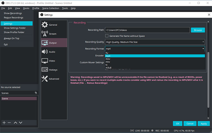 To change the OBS recording format, go to the "File > Settings > Output" menu. You will see the Recording Format option in the Recording module. Click to expand the drop-down list and select a recording format according to your needs. At last, click Apply and then OK to save the changed settings.