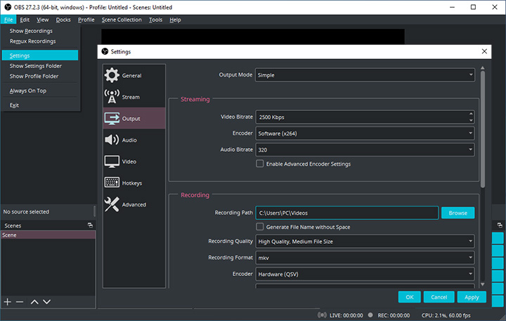 In OBS, the default recording path is the Video folder of your main documents folder. If you have changed the default save location, go to the "File > Settings > Output" menu in OBS. You can easily access the OBS recording folder by clicking the Browse button after recording.
