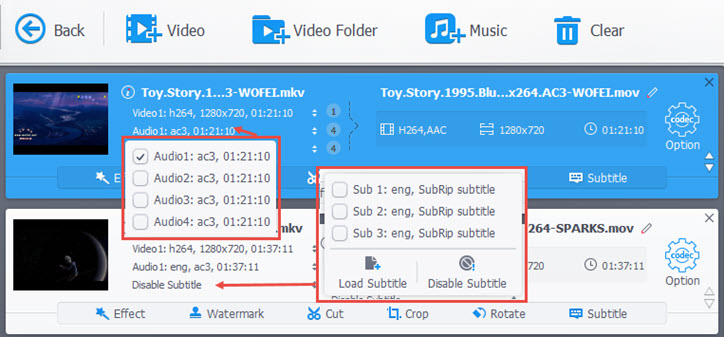 Choose a video track, an audio track, and a subtitle track under the file name of the source video.