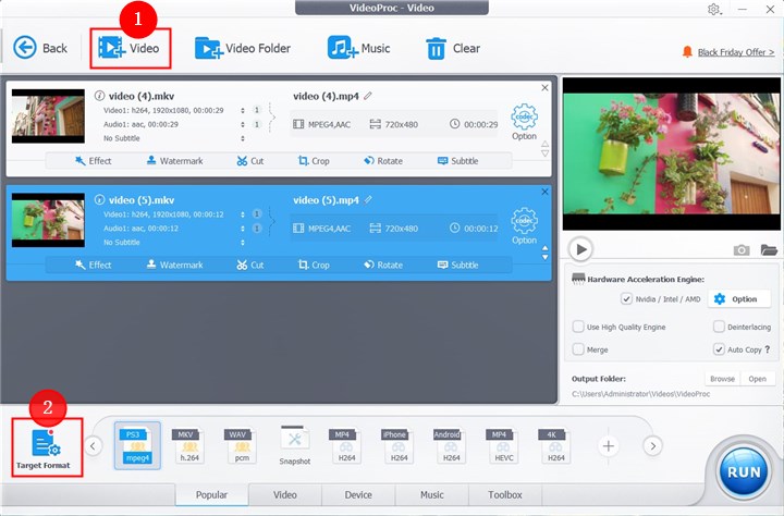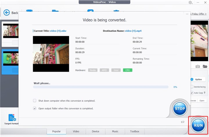 Step 4. Click RUN when you're ready. Then your MKV files will be converted PS3 supported formats immediately.
