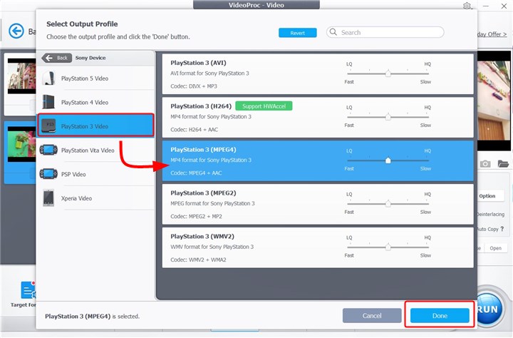 Step 3. Choose Sony Device - PlayStation3 Video - choose a format you want - Done.