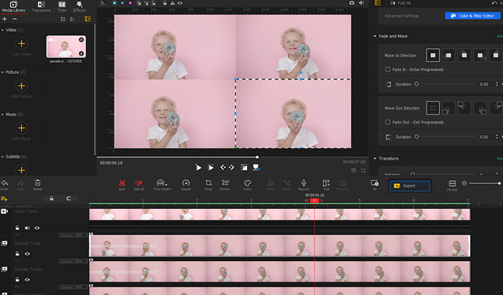Drag another video to the Overlay Track you just added and adjust the position of these videos. You can also select each video and adjust its color, brightness, playback speed, aspect ratio, and more.