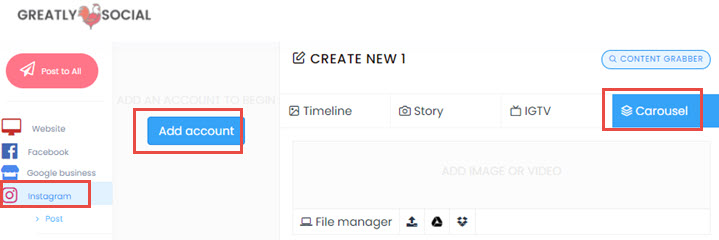 - Click Add account to allow Greatly Social to have access to your Instagram, so that you can schedule the post with this platform.