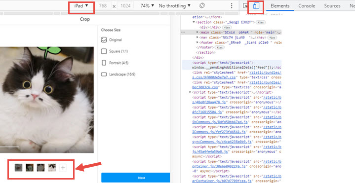 If you choose iPhone mode or other mobile modes, the screen is quite small to fit the photo-adding window on Instagram. Use tablet mode such as iPad Pro.