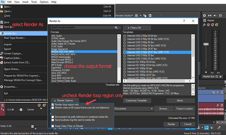 The Sony Vegas not rendering the whole video error can happen for several reasons, but in most cases, it's caused by you've selected Render Loop Region Only under the Render As window. The Loop Playback feature itself is great for improving editing efficiency. After marking a certain section by adding I/O points on the timeline and enabling the Loop Playback feature, you can play back the marked section repeatedly. However, the problem is Sony Vegs renders only the loop region by default, which often leads to Sony Vegas not rendering full video. To fix this error, simply follow the below steps: