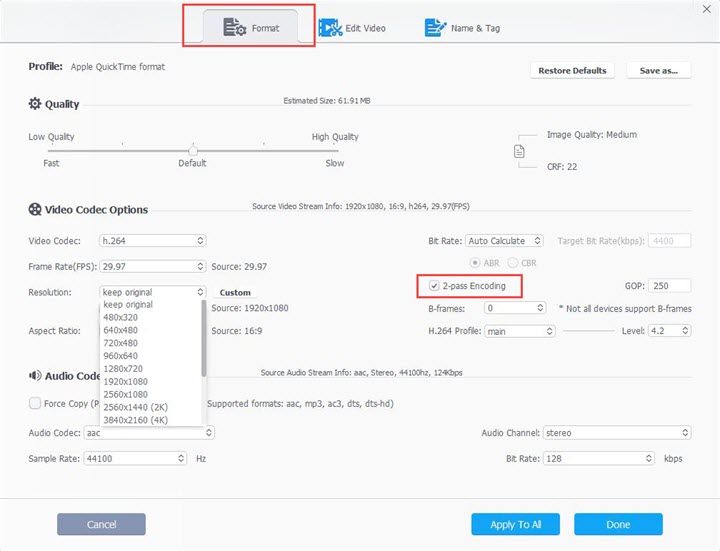 Though the program has refined and fully leveraged your file while converting, you can still further your adjustment to suit your particular requires. Click the Option button > Format to adjust and reset video quality, codec, and sample rate. Furthermore, don't forget to enable 2-pass Encoding to convert MP4 to Sony Vegas format with the least quality loss.