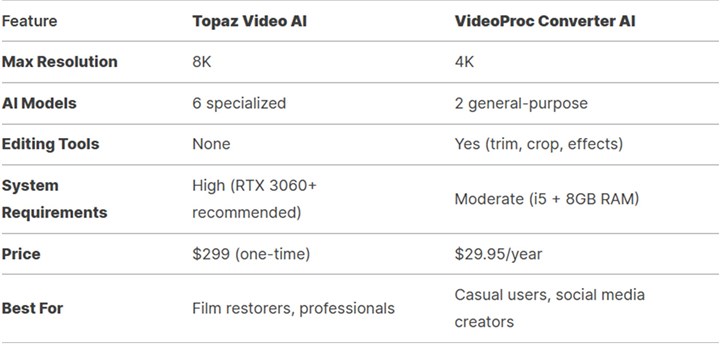 | Feature/Aspect | VideoProc Converter AI | Topaz Video AI |