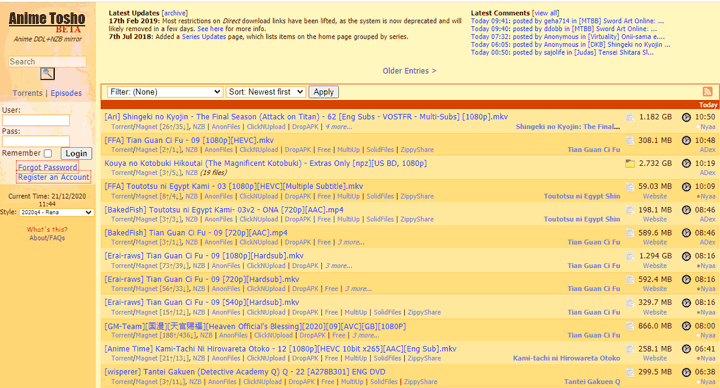 Even though the appearance of Anime Tosho looks like it's straight out of the 90s, it's one of the best torrent sites for anime that offers both dubbed and subbed anime series in HD (high definition). The difference between Anime Tosho and other torrent sites on this list, it's a mirror service that won't allow the torrents uploading.