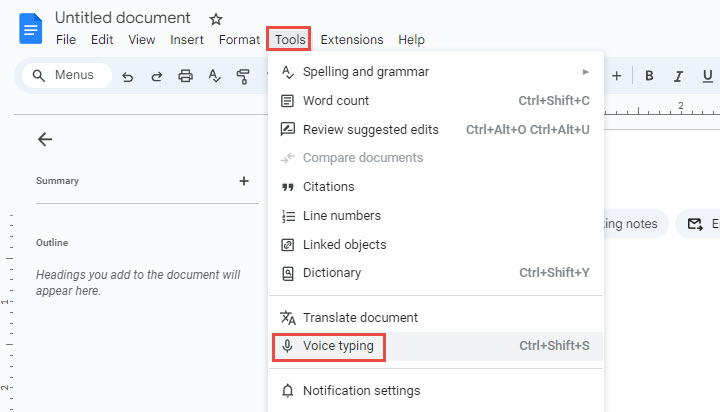 Step 2. Move to the top toolbar, and click "Tools" > "Voice typing". Allow it to use your mic.