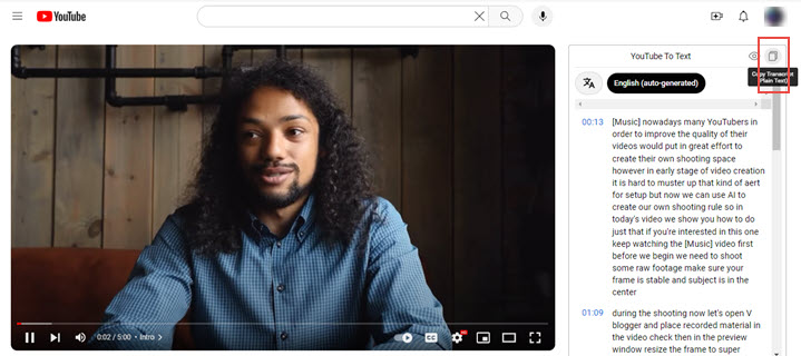 Step 3. Play a video, and you'll see the "YouTube to Text" tool on the right side of the video.