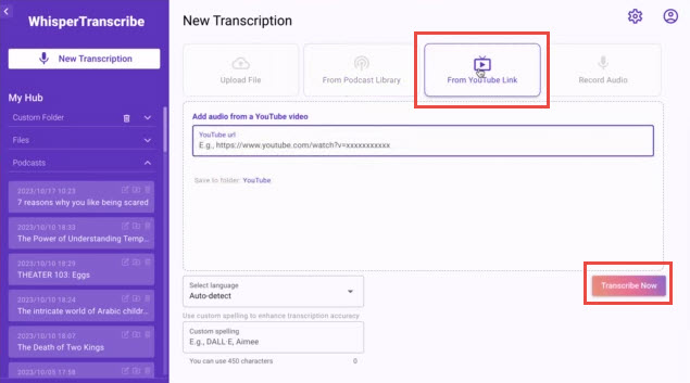 Step 3. Click "From YouTube Link", and paste the video link to it. Hit "Transcribe now".