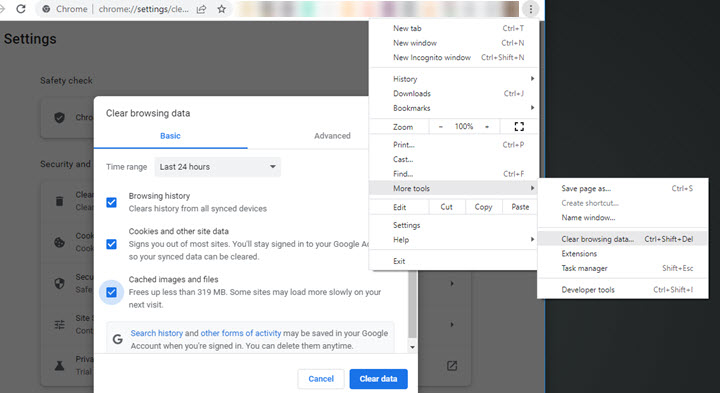 Given that too many cookies and cached files are accumulated with time passing by, available hard drive space gets less. Besides, encrypting and decrypting cookies require additional coding. And they will eventually drag down the browser's performance. So when you get an error report when playing videos in Google Slides, try to delete cookies and cache with the instruction below.