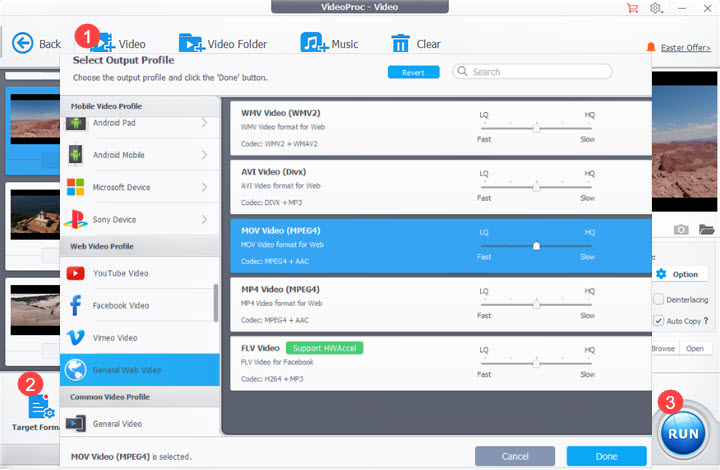 Step 2. Click "Target Format". Scroll down the output profile options and click "General Web Video". Select a format, for example, MOV (MPEG4 + AAC). Click "Done".