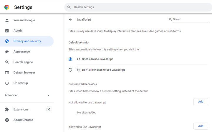 - Navigate to "Privacy and security" > "Site Settings" > "JavaScript".