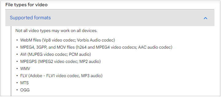 Alternatively, search in the top box and choose other formats supported by Google Drive and Google Slides like WebM (VP8 + Vorbis).