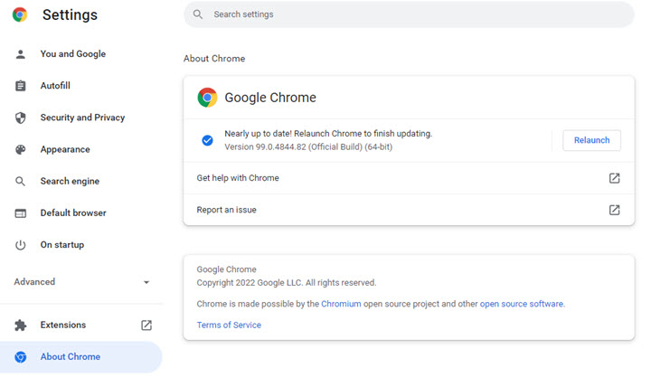 To update Google Chrome: Open Chrome settings and click "About Chrome". Then it will check for updates. If it's available, update the browser and re-launch it to see if unable to play video error 5 is solved in Google Slides.