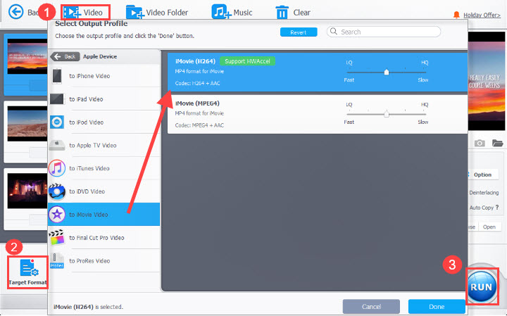 Step 2. Go to "Target Format" > "Apple Device" > "to iMovie Video" and choose iMovie (H.264). Click "Done".