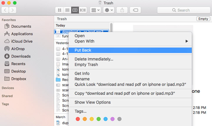 Find the recycle bin icon on your Dock or Desktop. Double-click on it, find the deleted file and restore it to the original file folder. If the Recycle Bin is missing, use the Go to Folder feature in the Finder Go application, search Trash, and then you can get the Trash Folder.