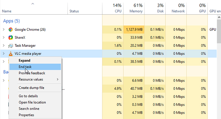 Windows users can open Task Manager using the keyboard shortcut Ctrl+Alt+Delete. Right click on the VLC media player, then choose "End task".