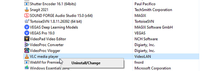 To uninstall VLC media player, go to the Control Panel > Programs > Uninstall a program. Browse and right click on the VLC media player, then click Uninstall.
