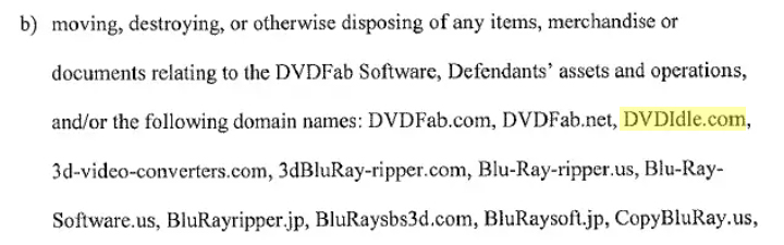 In 2014, the Advanced Access Content System Licensing Administrator (AACS LA) – backed by major studios – took aim at Fengtao Software's products. They sued the DVDFab group for its DVD/Blu-ray ripping tools, and a U.S. court issued a broad injunction. In the injunction list, DVDIdle.com was specifically named among domains to be disabled.