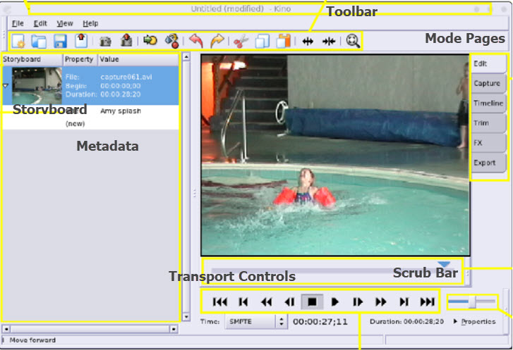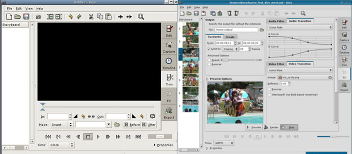 Kino: It is a storyboard-based video editing software with a graphic user interface. Its interface is not so confusing, but still requires some learning curve to newbies. Though it is not timeline-based, users can still add music, effects, and transitions to the video. The drawback is, it may lead to a crash down if you add many assets of various formats.