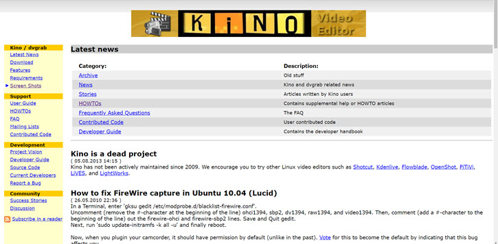 The webmaster of Kinodv.org didn't explain why they were shutting down the website. There is only a simple message that states the Kino tool hasn't been actively maintained since 2009, with recommendations for alternative tools: Flowblade, Kdenlive, LiVES, LightWorks, OpenShot, PiTiVi, and Shotcut.