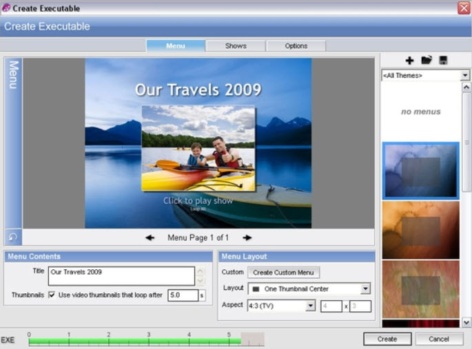 Proshow has a plethora of output options. Besides exporting the slideshow into an MP4 video – like most of today's slideshow makers do – it also supports creating the slideshow as a PC Executable file (.exe), screensaver, or burning to DVD, Blu-ray, and CD for users to playback (custom menus supported). Besides exporting, users can directly share the slideshow via email, to YouTube, Vimeo, SmugMug, Flash video, or Web show for personal sites.