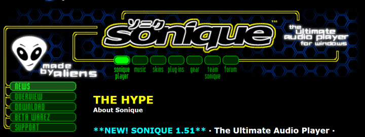 In the era of Windows software appearance customization, Sonique was the top dog that allowed users to customize all the graphics, visuals, and even the shape of the player. Sonique and over 350 skin stocks in total. It published "Skin of the Day", the newest 5 skins, and the top 10 skins on this website for users to pick up and download. Among those skins, "Organique", "E-razor", and "Fluid" were the most popular and most downloaded ones.