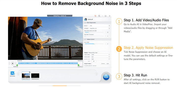 In addition to hardware problems, for problems with the audio file itself, such as poor audio quality, we recommend using sound quality improvement tools such as VideoProc Converter AI. This software comes equipped with an Audio AI feature that can significantly improve your audio quality by removing noise, making it clearer and more vibrant.