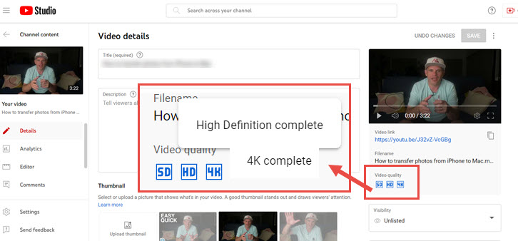 When the high-resolution processing is done by YouTube, you can go back to the uploading page, and check the video status from Unlisted to Public.
