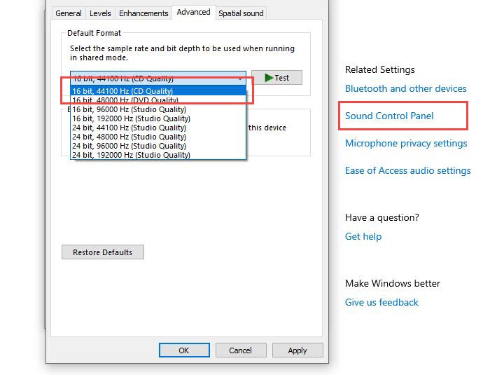 Step 4. Go to the 'Advanced' tab, and in the drop-down menu, select '16 bit, 44100 Hz (CD Quality)' option. Click Apply, and then you go back to the player to see whether the problem has vanished or not.