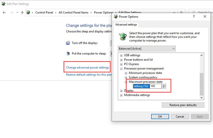 Step 3. In the Power Options dialogue box, go to 'Processor Power Management' > 'Maximum Processor state', and see if the Plugged-in percentage is 100% or not; if not, increase it to the maximum, and click OK to apply the changes.
