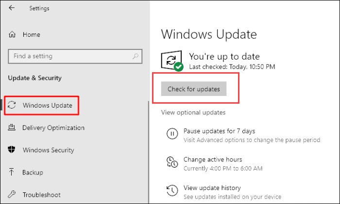 Step 2. Find Windows Update, click on Check for updates to see if any update is available.