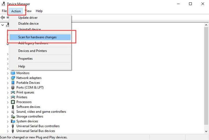 Step 4. Go to the 'Action' menu in the toolbar at the top, select 'Scan for hardware changes' to reinstall the driver.