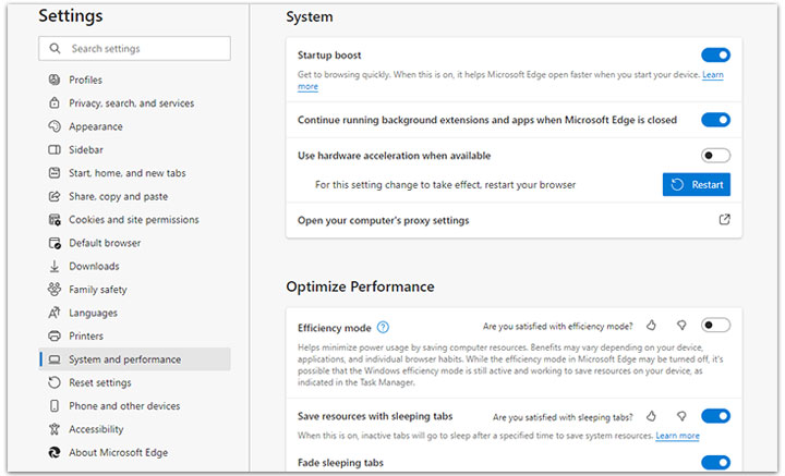 Step 3. Under Hardware-accelerated graphics, toggle the switch next to Always to Never. Restart Edge and test YouTube.