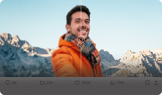 Upscale videos by 400%, transforming blurry, noisy, grainy, or compressed footage into crisp, natural HD/4K quality.