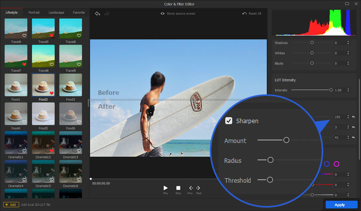 Step 5. Adjust the value of each slider to sharpen your video and achieve more favorable effect. You can add a maximum amount and gradually slide it back to the point you feel just right on your footage. The parameter settings really depend on how crispy you want your footage to be and whether it brings out the detail you want.