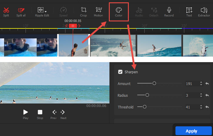 You can experiment with these sliders, nudging the knob back and forward to get the best sharpened footage you want.