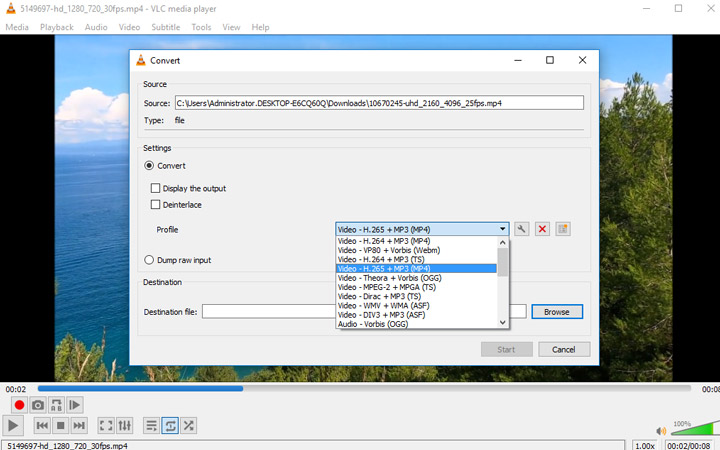 Step 4. Select a destination folder, and hit Start to start the video compression in VLC media player.
