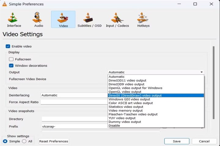 2. Choose the Video tab. Try different options from the drop-down menu until you find one that works for your video file and display device. For example, DirectX (DirectDraw) video output, OpenGL video output, etc.