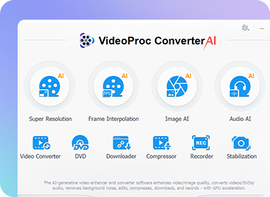 VideoProc Converter AI is an all-in-one solution for you to enhance videos/images/audio, convert any format, compress large files without losing quality, download videos or audio from online sources, record, or edit quickly.