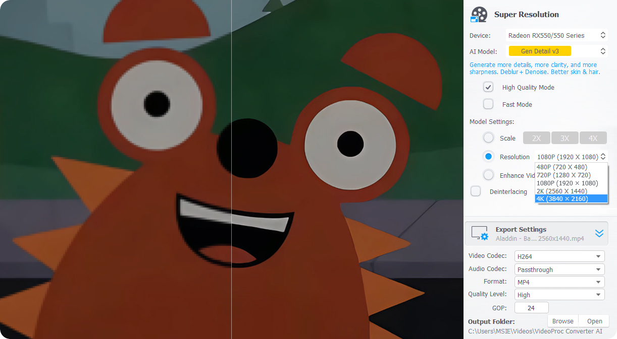 Super Resolution in VideoProc is an AI-powered tool designed to upscale and enhance video quality. It offers four specialized AI models to tackle different types of footage, automatically fixing blurry, noisy, or grainy videos for realistic and natural 4K results. The result: every clip becomes sharper, clearer, and ready for the timeline.