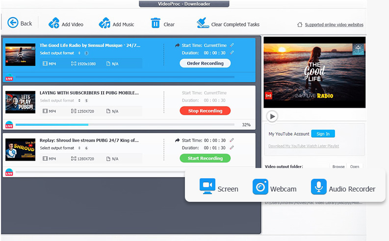 - Capture footage: Shoot with cameras, phones, or action cams. You can also use VideoProc to download online media or record screen and audio.